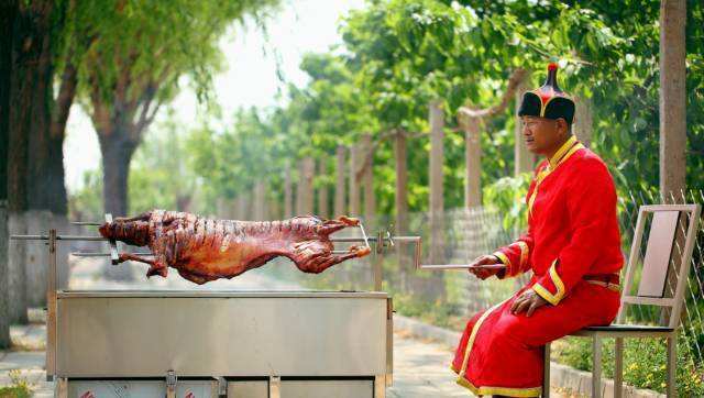 烤全羊是蒙古族人民膳食的一种传统地方风味肉制品,一道最富有民族特色的大菜,是千百年来游牧生活中形成的传统佳肴,也是蒙古族招待贵宾的传统名肴。