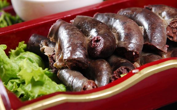 血肠制作的主要原料是羊小肠和羊血。羊血是通过蒙古掏心法杀羊后的产物,将盐、葱末、少量的水和面粉放入羊血中,调成血浆。再将羊肠用盐水洗净,灌入调好佐料的羊血,细线扎紧羊肠两头于水中煮熟。