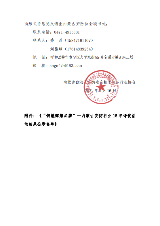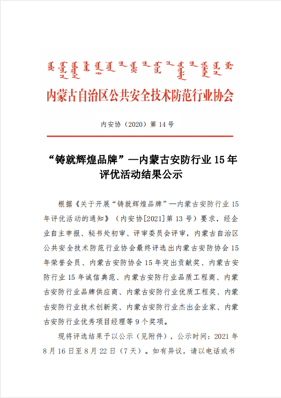 “铸就辉煌品牌”—内蒙古安防行业15年评优活动结果公示名单