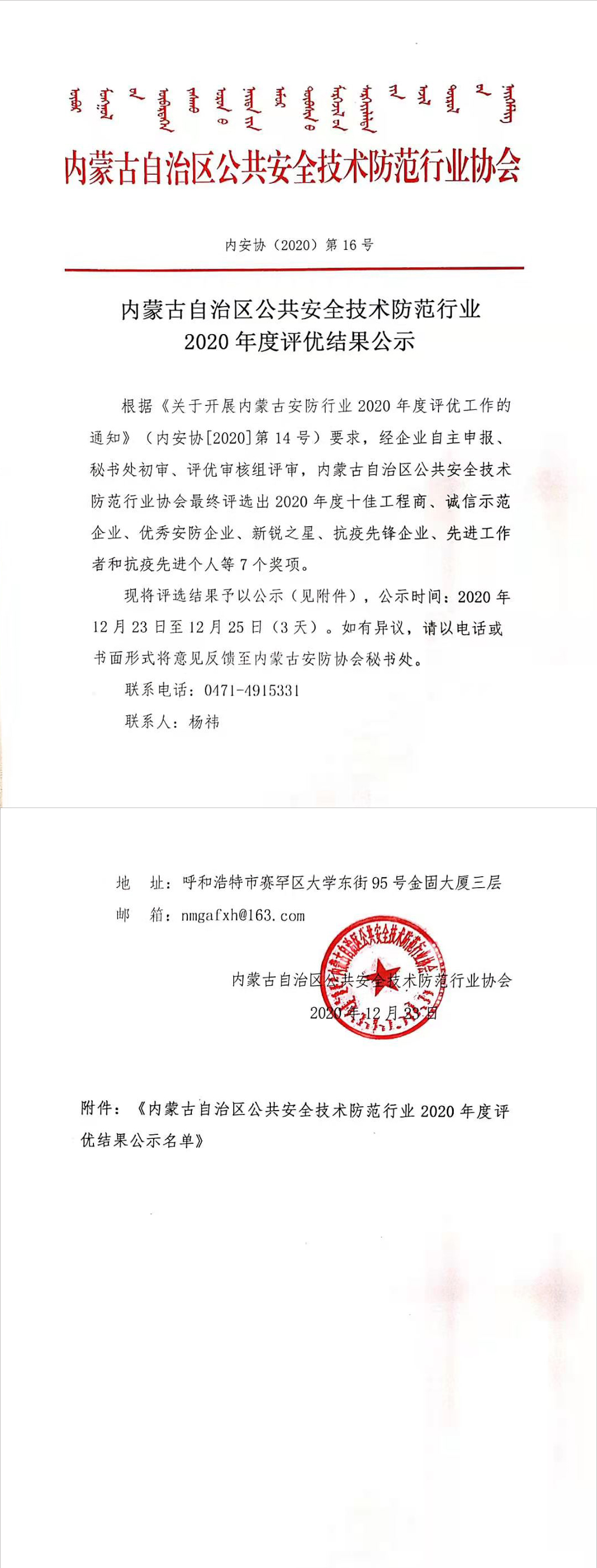 内蒙古自治区公共安全技术防范行业2020年度评优结果公示名单