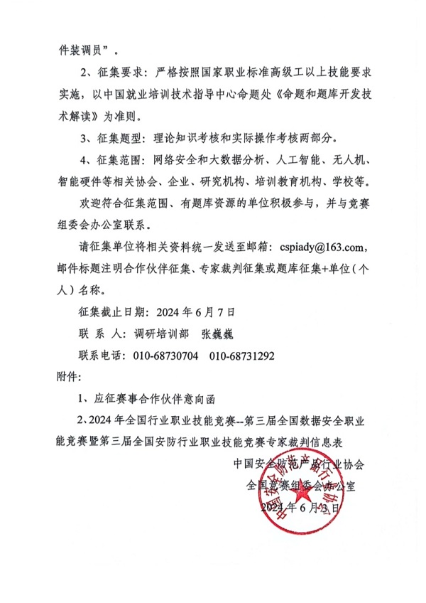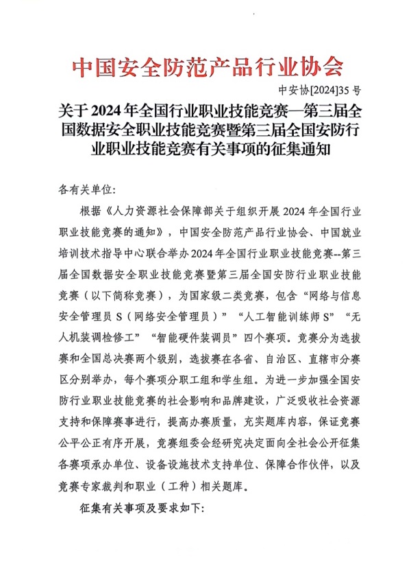关于2024年全国行业职业技能竞赛—第三届全国数据安全职业技能竞赛暨第三届全国安防行业职业技能竞赛有关事项的征集通知