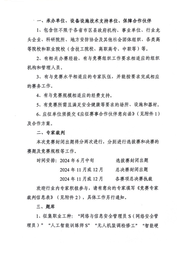 根据《人力资源社会保障部关于组织开展2024年全国行业职业技能竞赛的通知》,中国安全防范产品行业协会、中国就业培训技术指导中心联合举办2024年全国行业职业技能竞赛--第三届全国数据安全职业技能竞赛暨第三届全国安防行业职业技能竞赛(以下简称竞赛),为国家级二类竞赛,包含"网络与信息安全管理员S(网络安全管理员)""人工智能训练师S""无人机装调检修工""智能硬件装调员"四个赛项。竞赛分为选拔赛和全国总决赛两个级别,选拔赛在各省、自治区、直辖市分赛区分别举办,每个赛项分职工组和学生组。为进一步加强全国安防行业职业技能竞赛的社会影响和品牌建设,广泛吸收社会资源支持和保障赛事进行,提高办赛质量,充实题库内容,保证竞赛公平公正有序开展,竞赛组委会经研究决定面向全社会公开征集各赛项承办单位、设备设施技术支持单位、保障合作伙伴,以及竞赛专家裁判和职业(工种)相关题库。